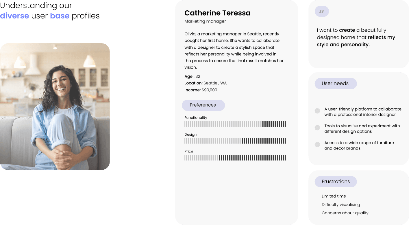 To identify the core challenges users face with home design tools, we conducted a series of user interviews and exploratory research. Participants shared their struggles with overwhelming choices, visualizing furniture placement, and navigating overly complex interfaces. These insights helped us define key usability problems